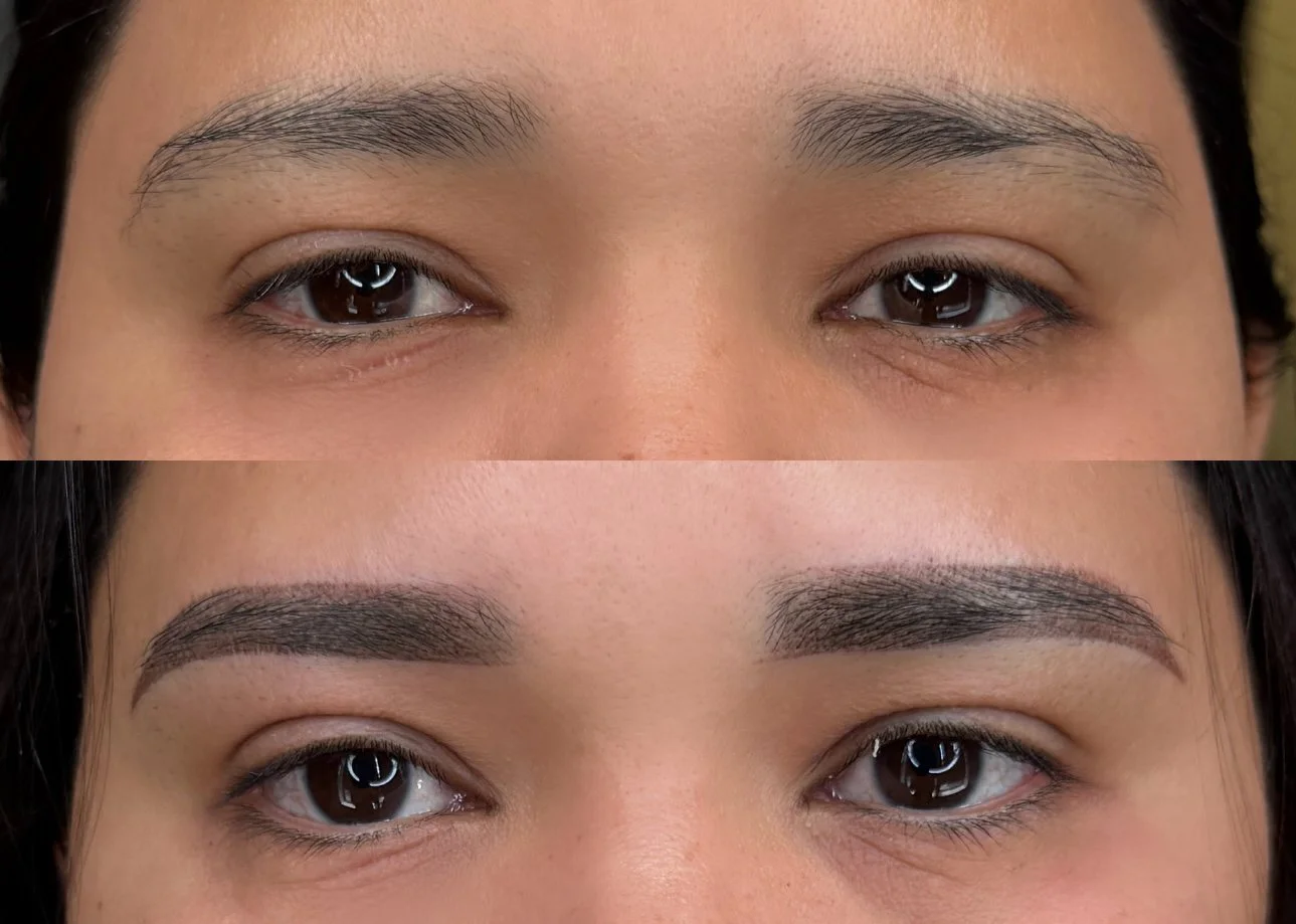Ombre Powder Brows are a semi-permanent makeup technique that enhances the natural look of your eyebrows with a soft, shaded effect, similar to the look of gently filled-in brows using makeup powder. Unlike microblading, which uses a blade to make fine hair-like strokes, the Ombre method creates a gradient of color that starts lighter at the front of the brows and gradually deepens toward the tail. Small pixels of pigment are deposited into the top layers of your skin to create a powdered makeup appearance that last for about 1-2 years.